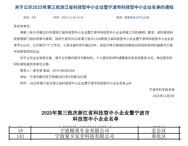 近日,根据宁波市科技局发布的《2025年第三批浙江省科技型中小企业暨宁波市科技型中小企业名单的通知》显示,协会会员单位宁波精英车业有限公司与宁波复卡安全科技有限公司入选。两家企业成功入库,不仅体现了协会会员在技术研发、创新应用及成果转化等方面的综合实力,也反映了行业企业在科技驱动下不断提高的发展潜力。