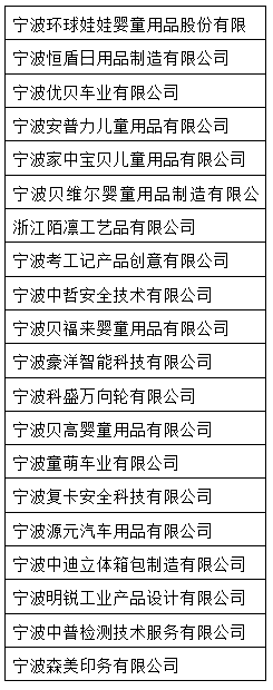 此次入库的企业包括:协会常务副会长单位宁波环球娃娃婴童用品股份有限公司;副会长单位宁波恒盾日用品制造有限公司、宁波优贝车业有限公司、宁波安普力儿童用品有限公司;理事单位宁波家中宝贝儿童用品有限公司、宁波贝维尔婴童用品制造有限公司、浙江陌凛工艺品有限公司;会员单位宁波考工记产品创意有限公司、宁波中哲安全技术有限公司、宁波贝福来婴童用品有限公司、宁波豪洋智能科技有限公司、宁波科盛万向轮有限公司、宁波贝高婴童用品有限公司、宁波童萌车业有限公司、宁波复卡安全科技有限公司、宁波源元汽车用品有限公司、宁波中迪立体箱包制造有限公司、宁波明锐工业产品设计有限公司、宁波中普检测技术服务有限公司、宁波森美印务有限公司。