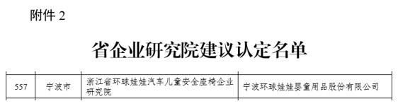 近日,浙江省经济和信息化厅发布了《2025年度拟认定浙江省重点企业研究院、企业研究院名单的公示》,协会常务副会长单位——宁波环球娃娃婴童用品股份有限公司组建的“浙江省环球娃娃汽车儿童安全座椅企业研究院”成功入选省企业研究院名单,为我市玩具和婴童用品产业的高质量发展注入了新动能。