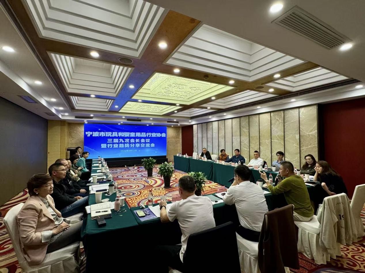 2026年4月11日下午,宁波市玩具和婴童用品行业协会三届九次会长会议暨行业趋势分享交流会在阳光豪生大酒店顺利召开。会议伊始,协会组织全体与会人员专题学习解读国家"十五五"规划纲要中关于消费品工业、新质生产力、儿童友好城市建设等相关政策精神,深刻领会国家战略导向,为协会工作与产业发展锚定方向、凝聚共识。协会会长、副会长单位及监事会成员出席会议,共话行业发展,共谋产业未来,会议由协会副会长兼秘书长胡天明主持。